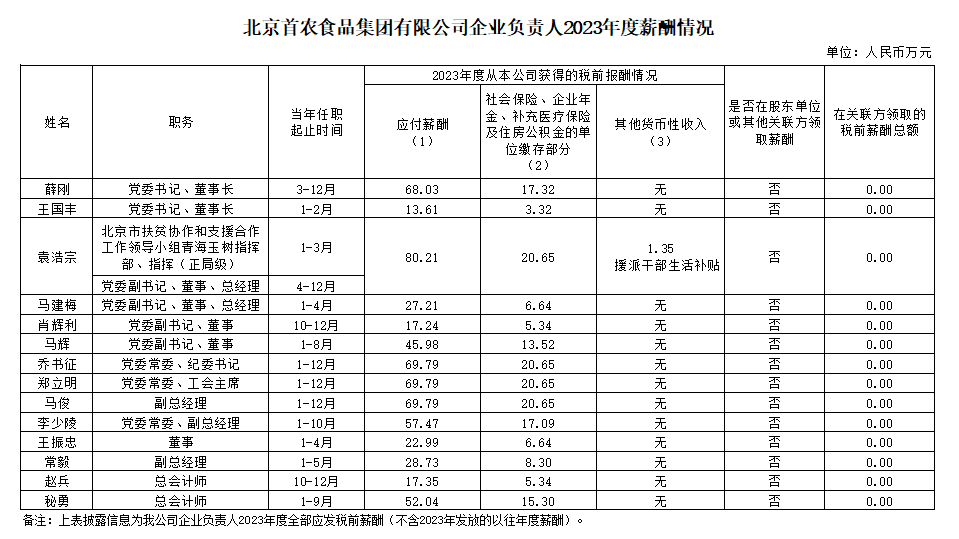 北京Z6尊龙·凯时食品集团有限公司企业负责人2023年度薪酬情况